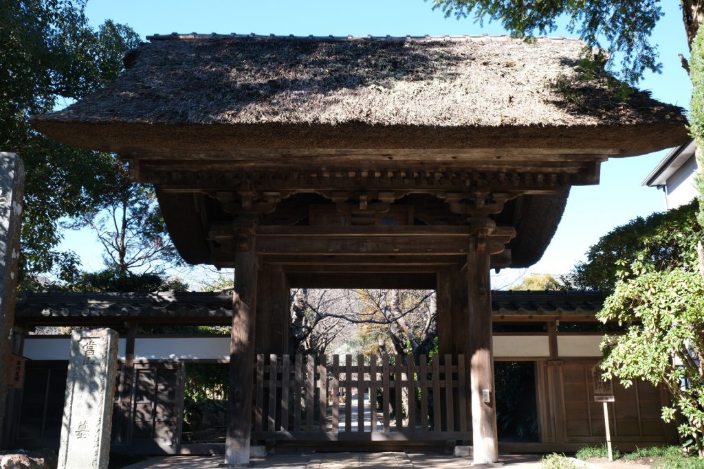 ▲極楽寺の入口にある茅葺屋根の山門。初夏には紫陽花が彩りを添えます