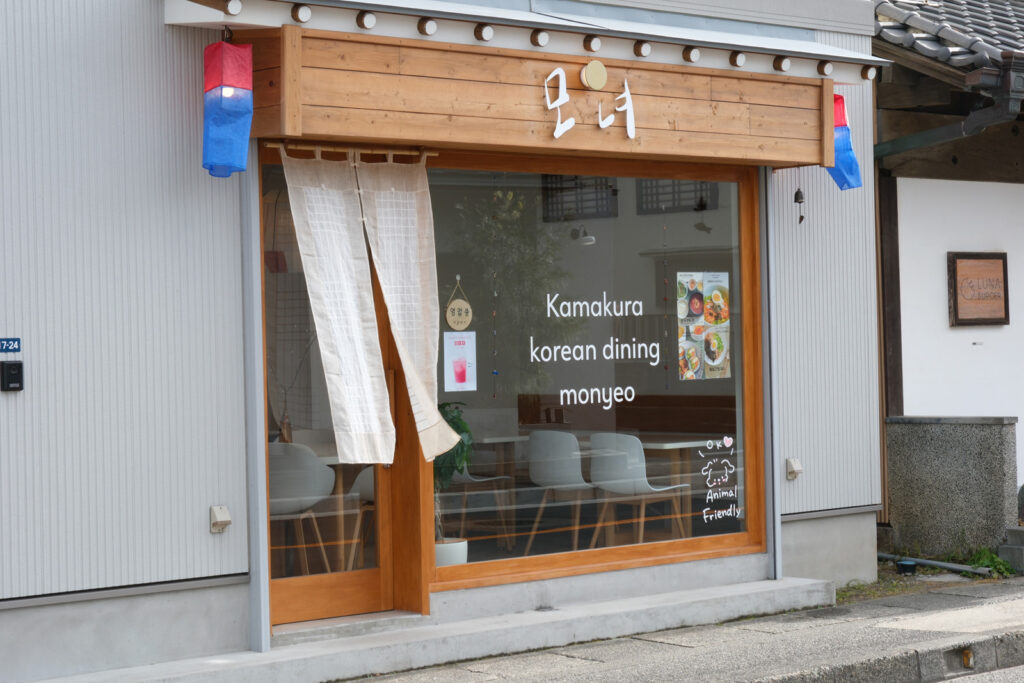 鎌倉大仏殿 高徳院の近くには、花寺としても人気の長谷寺や光則寺や個性的な雑貨店なども多い人気のエリアです。そんな長谷歩きの途中にぜひ立ち寄りたいのが、2025年春にオープンした「Kamakura korean dining monyeo(モニョ)」です。ハングル文字の看板と、韓国を象徴する赤と青のライトオブジェが目印です。窓の外には、踏切を通過する江ノ電がゆったりと走り去る――。そんな長谷らしい景色を眺めながら、本格的な韓国の家庭料理を味わえる一軒です。