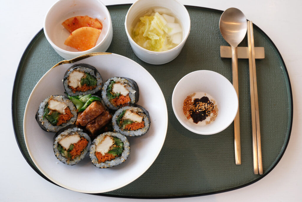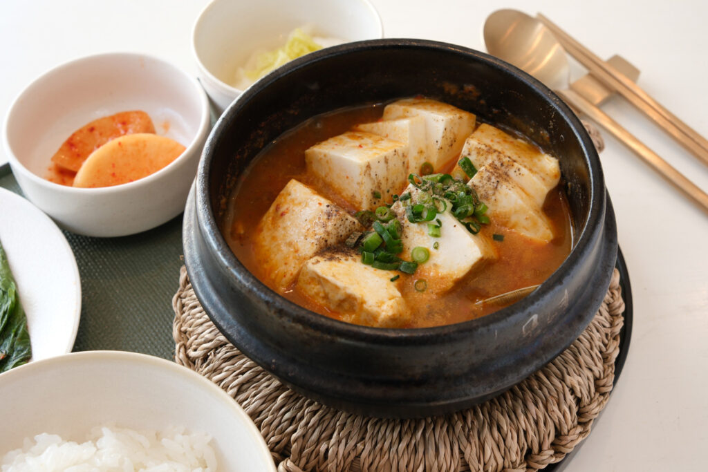 お店のメニューは、唐辛子仕立ての豆腐スープ、スンドゥブチゲをはじめ、グクス(韓国の麺料理)や日本でもすっかり定着したキンパなど韓国の定番料理です。どれも厳選した材料を使い、現地の家庭的な調理法で丁寧に作られています。さらに嬉しいのが、フードは全て、グルテンフリーとなっており、一部は動物性材料も使わないヴィーガンにも対応しています。