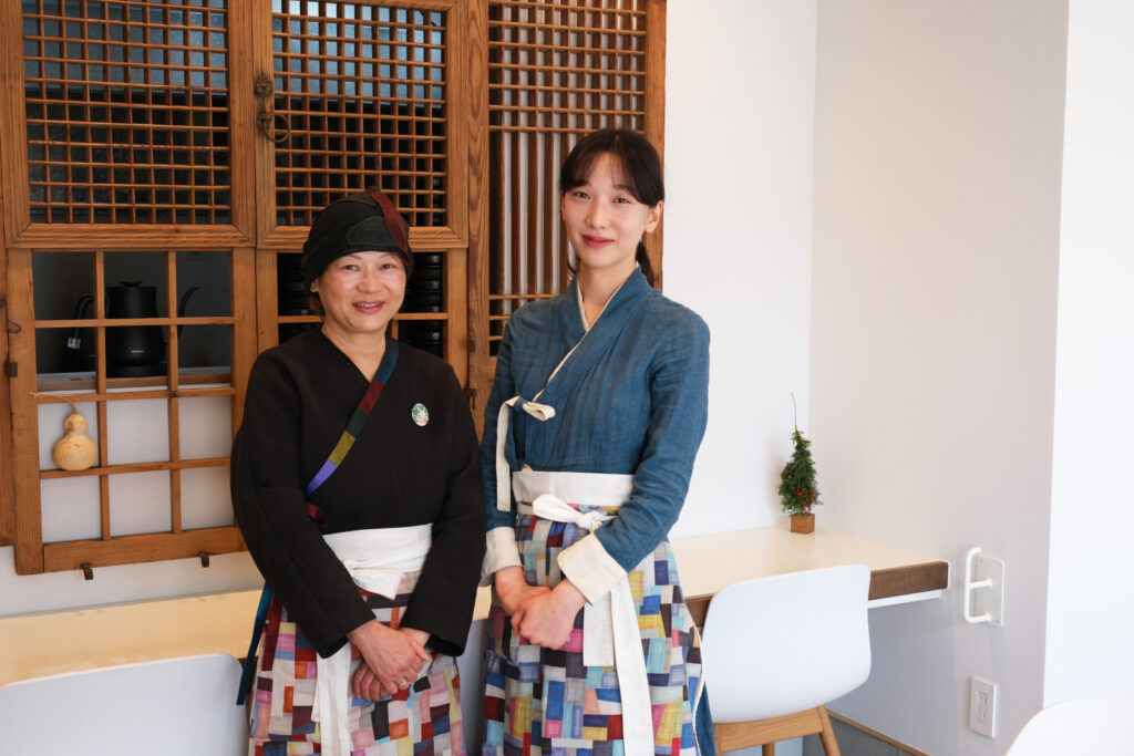 ▲パッチワーク柄の前掛けがカワイイ!伝統衣装「韓服(ハンボク)」で店頭に立つ恭子さんと結菜さん。店頭のタペストリー、和紙にプリントされた「赤ちゃんを抱く女性」もお二人のお写真なのだそう
