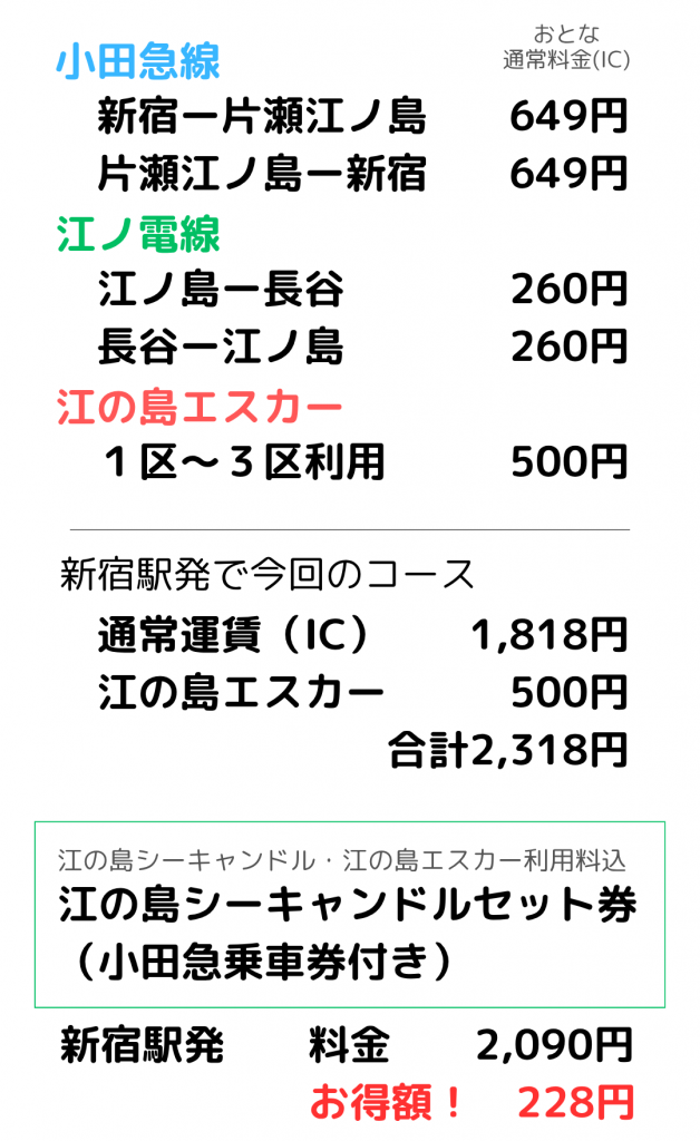 通常の運賃(IC)と江の島エスカーの利用額と比較した場合、「江の島シーキャンドルセット券(小田急乗車券付)」を使うことで、228円お得になります。