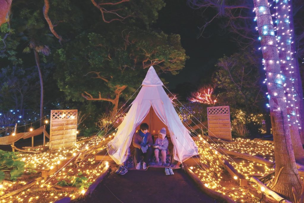 江の島の頂上【江の島サムエル・コッキング苑】の園内にそびえる展望灯台【江の島シーキャンドル】から、放射状に広がる“光の大空間”が夜の合図。帰り道は、港の灯りが見下ろせるデッキや弁天橋のイルミネーションも余韻にどうぞ。