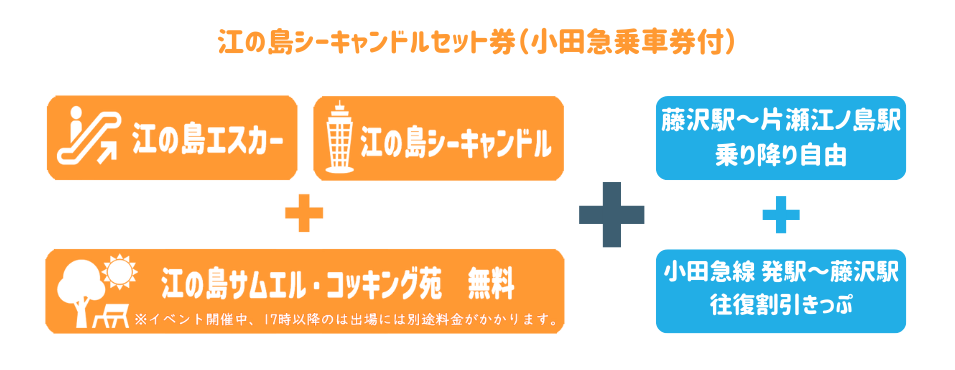 さらに小田急乗車券付きを選べば、小田急線発駅から藤沢駅までの往復割引乗車券と小田急線フリー区間(藤沢駅~片瀬江ノ島駅)がセットになります。小田急線沿線からおでかけの方は、このチケットが断然お得です!