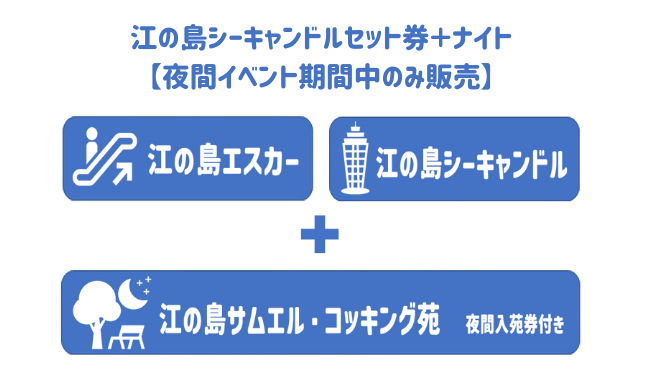 季節ごとに開催される夜間イベントの期間中のみ販売するチケット。江の島エスカーと江の島シーキャンドル(展望灯台)のご利用券に加え、夜間入苑料(500円)がセットになっています。イベント期間中はエスカー乗り場や江の島サムエル・コッキング苑入口のチケット窓口が行列になることも。デジタルチケットを購入すれば、並ばずスムーズに入苑できますよ!