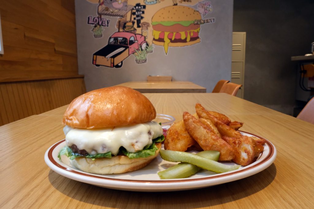 お店の旗艦メニューは、鵠沼海岸商店街の老舗【有田商店】から仕入れた和牛だけを使った、その名も「和牛100%バーガー」です。パティ以外の具材はシンプルに、レタスとチーズのみ。内側をバターで焼き温めたバンズに、レア気味に焼き上げたパティをサンド。がぶりと頬張れば、柔らかなパティから旨味と肉汁が溢れてきます。バンズも味わいがあり、ほのかにガーリックが香るアリオリソースとチーズも、打ち寄せるさざ波のようにジワリと追い打ちをかけてきます。