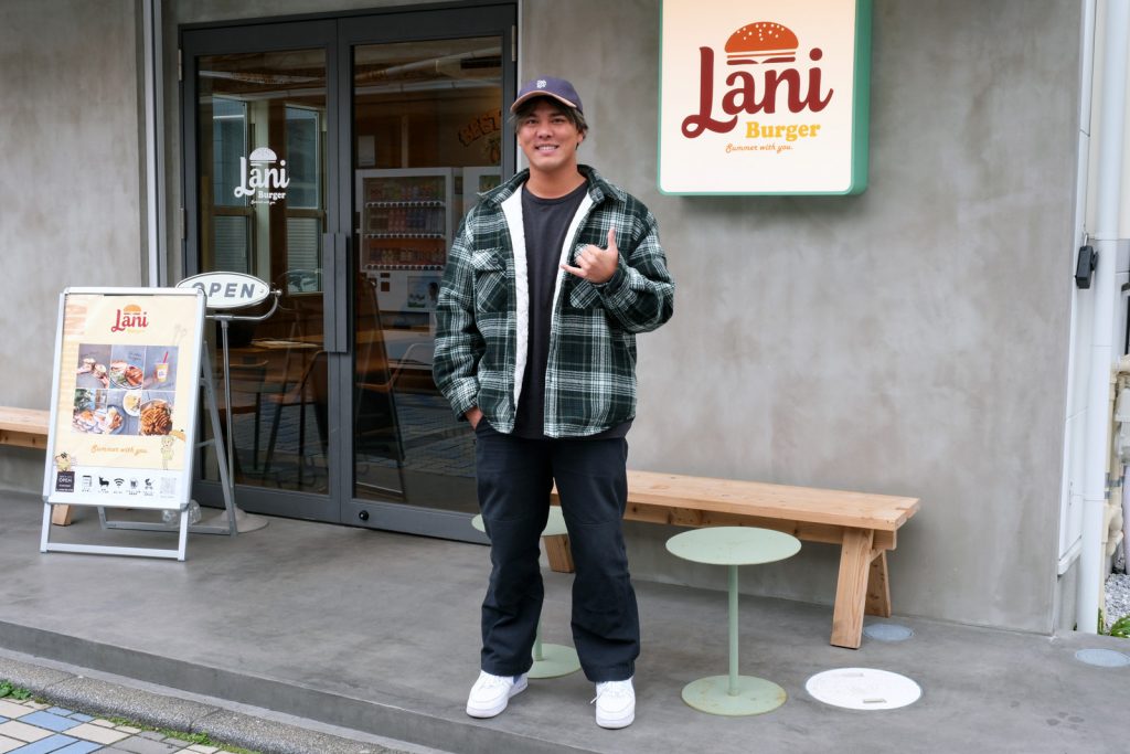 鵠沼海岸駅を出て、マリンロードと呼ばれる鵠沼海岸商店街の通りを江の島方面へ進んでゆくと、右手にあるのが【Lani Burger 湘南店】です。グレーの外壁に、Lani Burgerのロゴの看板が掲げられ、見落とすことはありません。2025年5月末に開店したばかりのお店です。本店は千葉県のサーフィンスポットで有名な一宮にあり、こちらの店舗は2号店とのこと。お店を営むのは、お隣りの茅ヶ崎市ご出身のプロサーファー川畑友吾さんです。