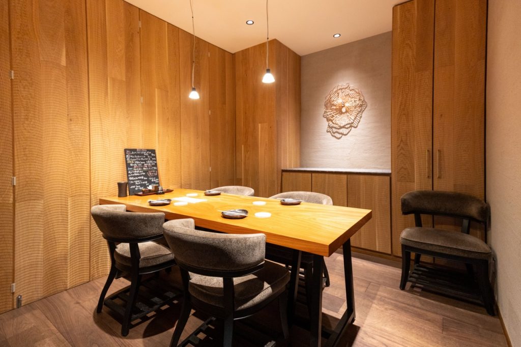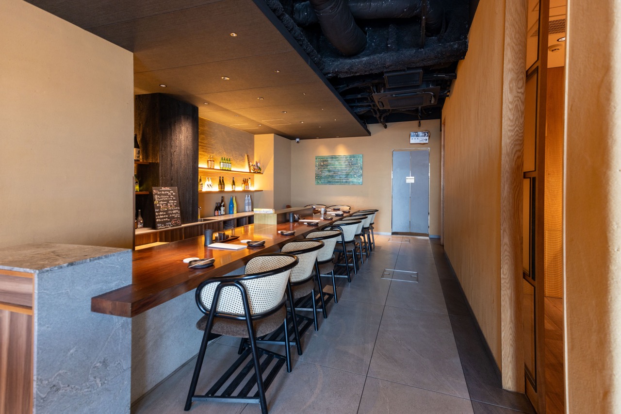 ▲素材により火加減を絶妙に加減しながら、目の前で一本一本丁寧に焼き上げる職人技の臨場感も味わえる焼き場の前のカウンター席