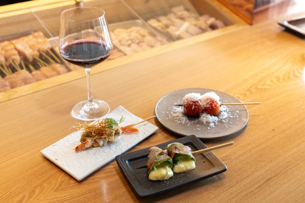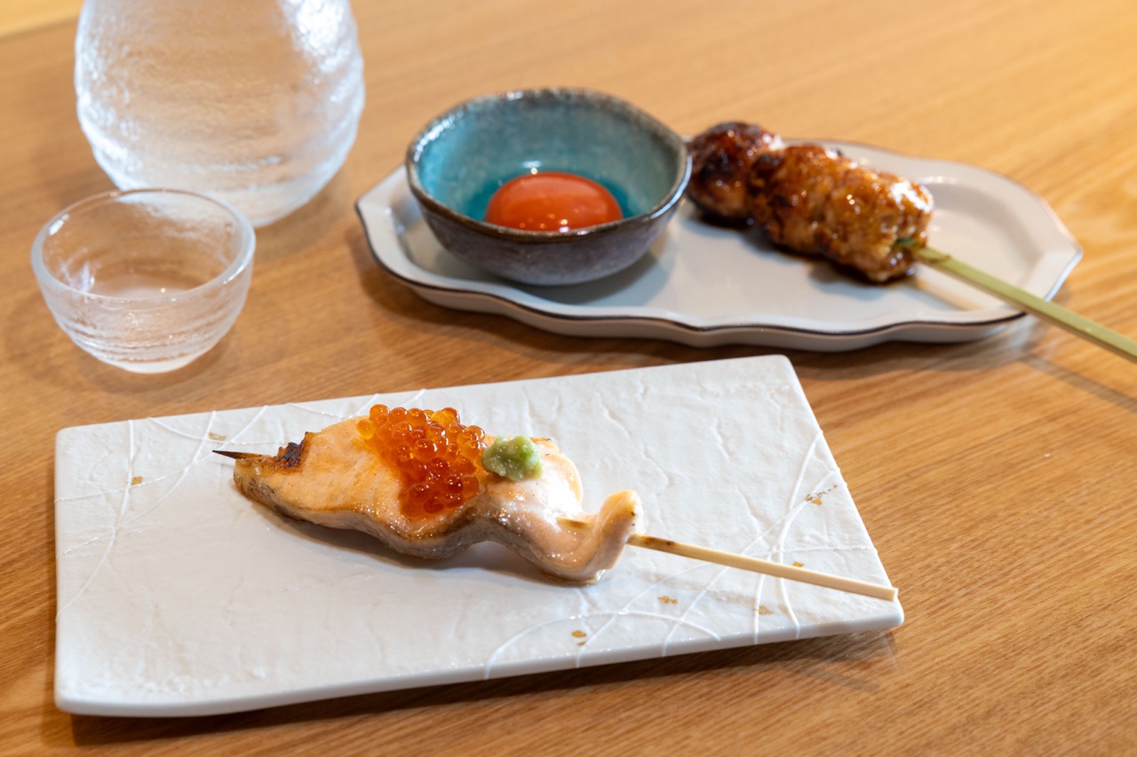 ▲人気の「サーモン親子串」(手前)は、程よく焼き上げたサーモンにイクラの醤油漬けとワサビを添えた贅沢な一品。他に太刀魚や穴子、帆立などの海鮮も通年味わえます。「つくね」にはぜひ、濃厚な蘭王をまとわせて日本酒とともに