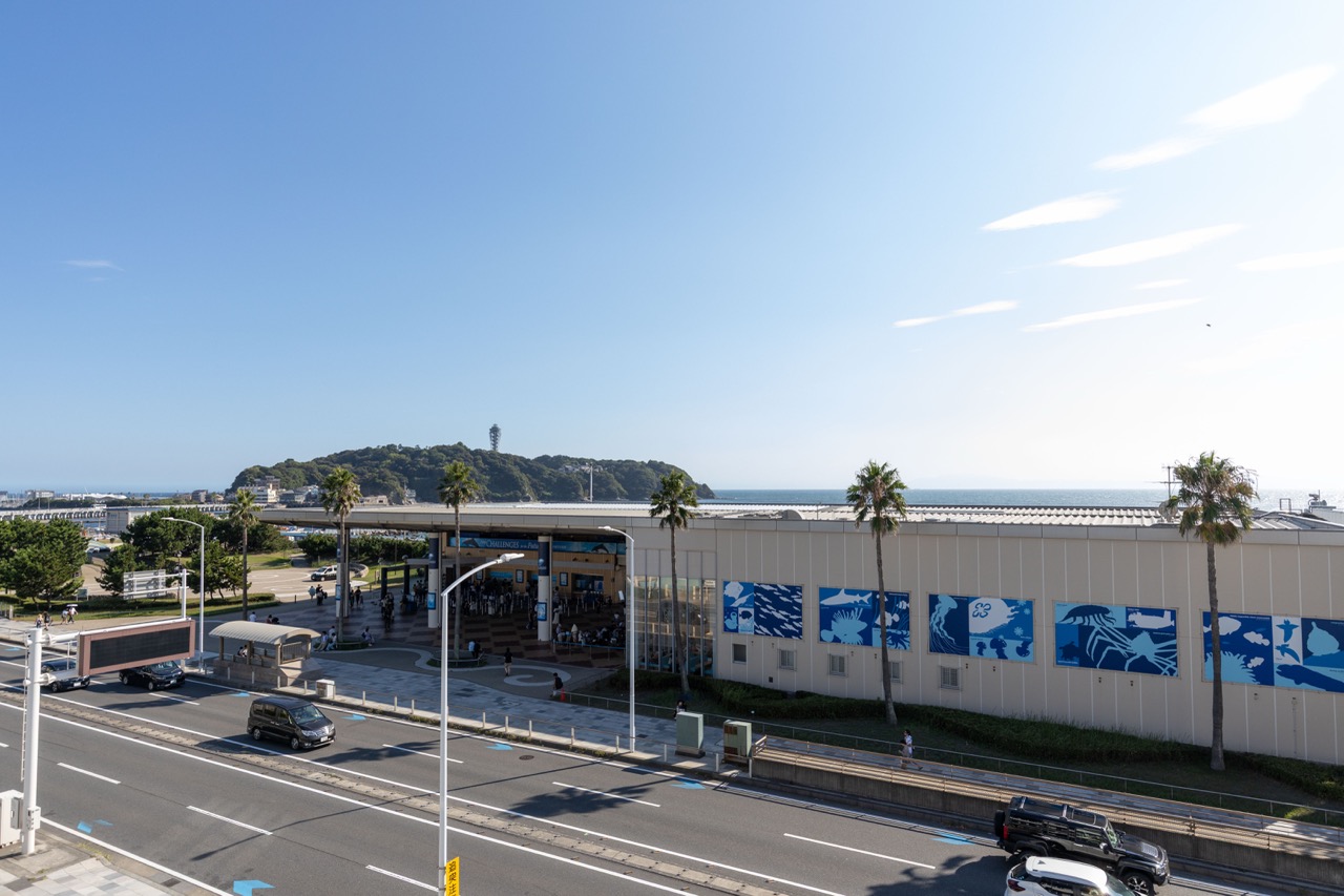 ▲国道134号線沿い、新江ノ島水族館越しに江の島を眺める絶好のロケーション
