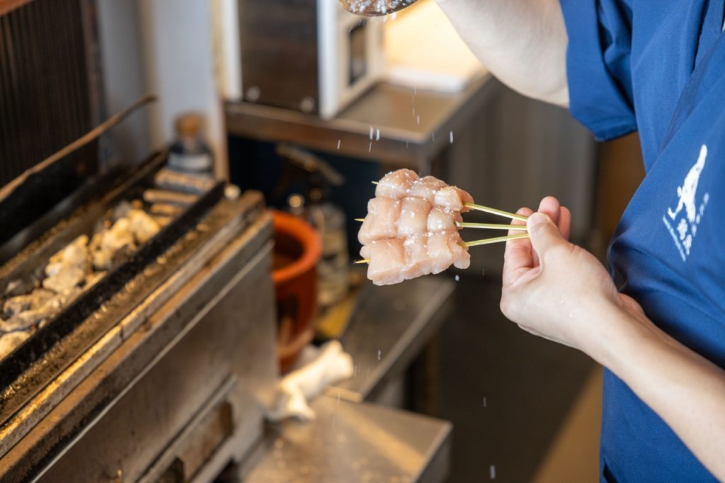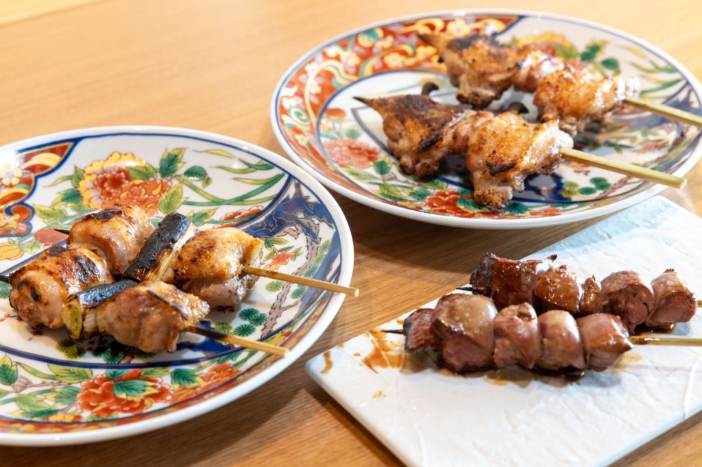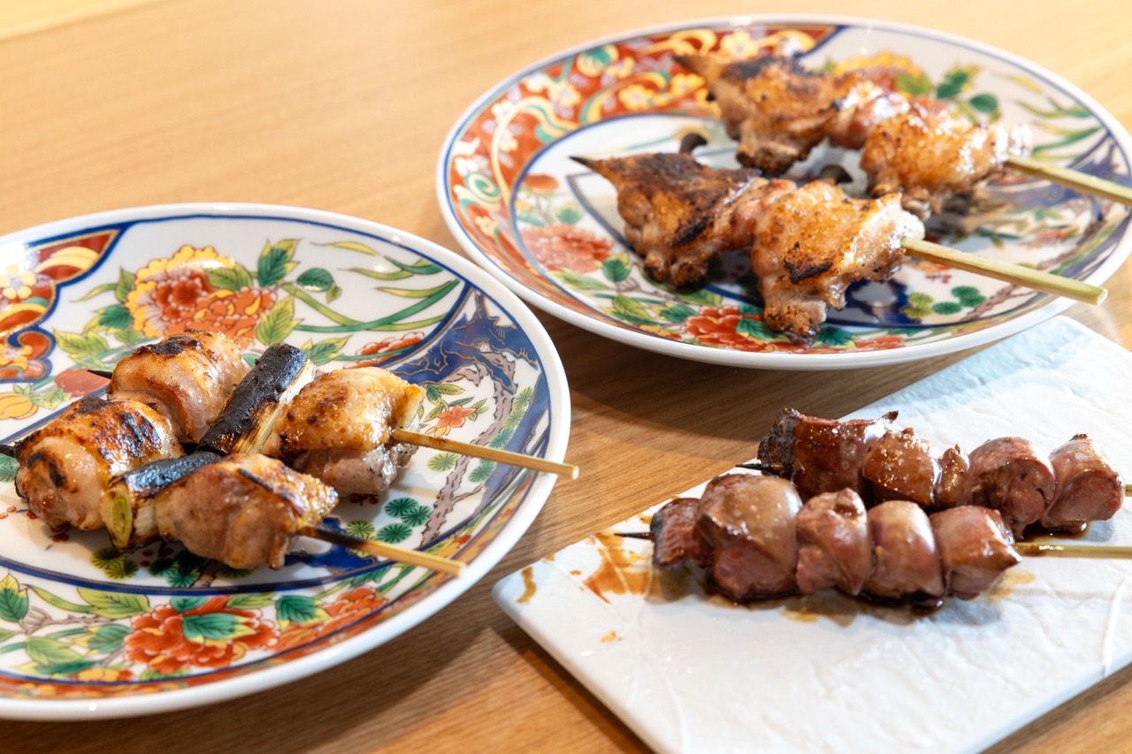 ▲ひと串ごとに大ぶりにカットされジューシーに焼き上げられた焼き鳥はどれも絶品。「ねぎま」(左)、「砂肝」(手前)、「手羽先」(各1本)
