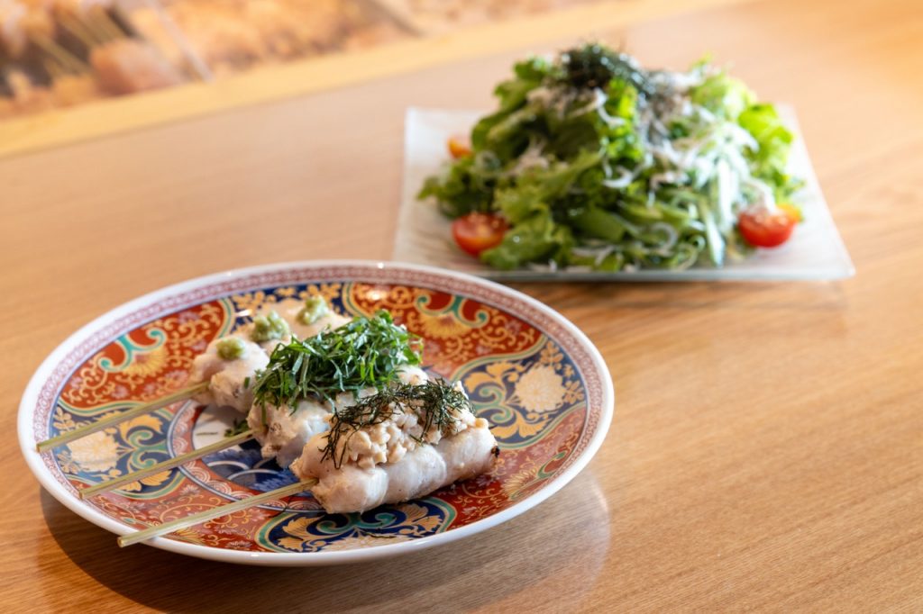 ▲鮮度の良さを生かし軽く表面を炙った「ささみ」(1本)。素材の持ち味を生かした繊細な旨みを味わえます。選べるトッピングは、わさび、梅しそ、納豆の3種。胡麻油で香り高く風味付けた「しらすと京ネギのさらだ」