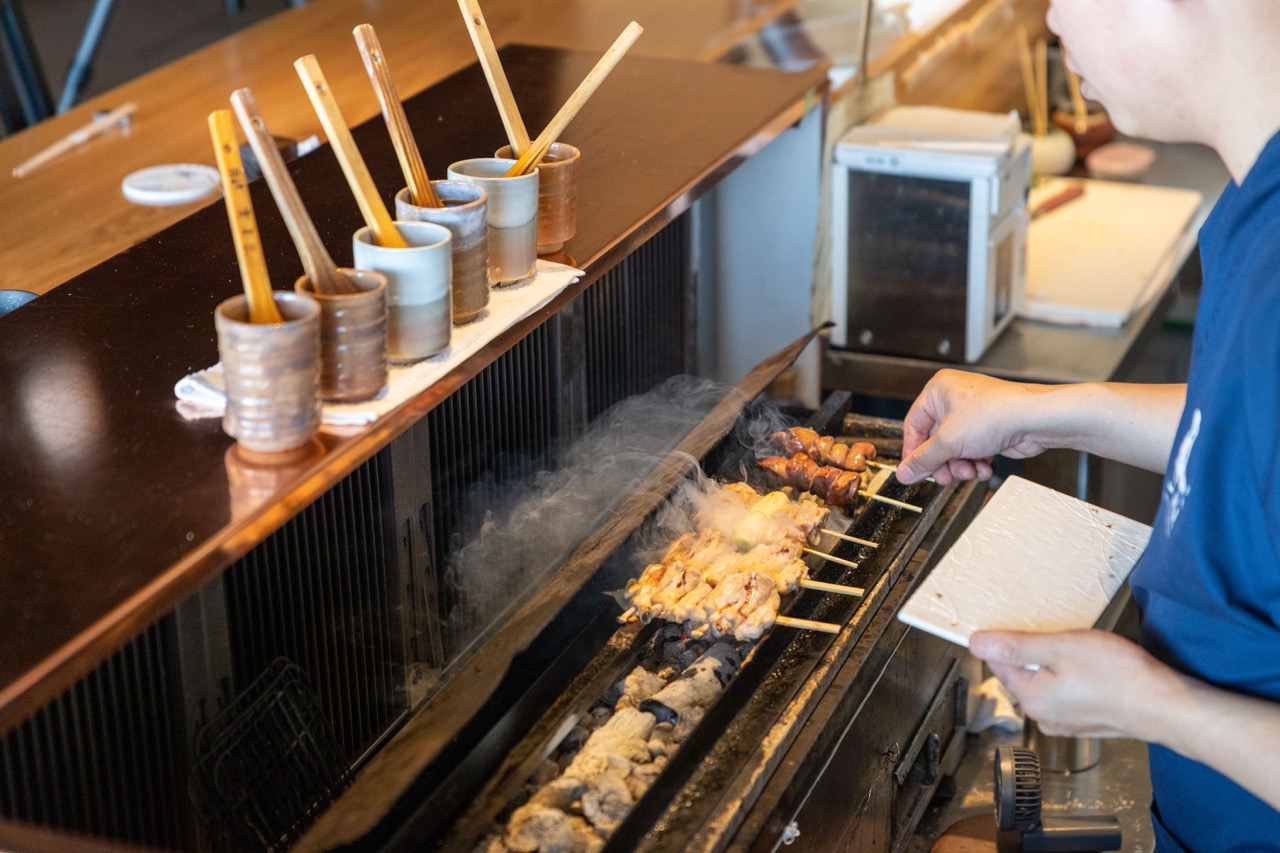 国道134号線沿い、新江ノ島水族館の向かいというロケーションながら、海岸線の喧騒からは隔離された落ち着いた空間で、本格炭火串焼きを堪能できる店。焼き場を備えたカウンター席では、熟練の職人が目の前で一本ずつ丁寧に焼き上げる様子を眺めながら熱々焼き立てを味わうことができます。