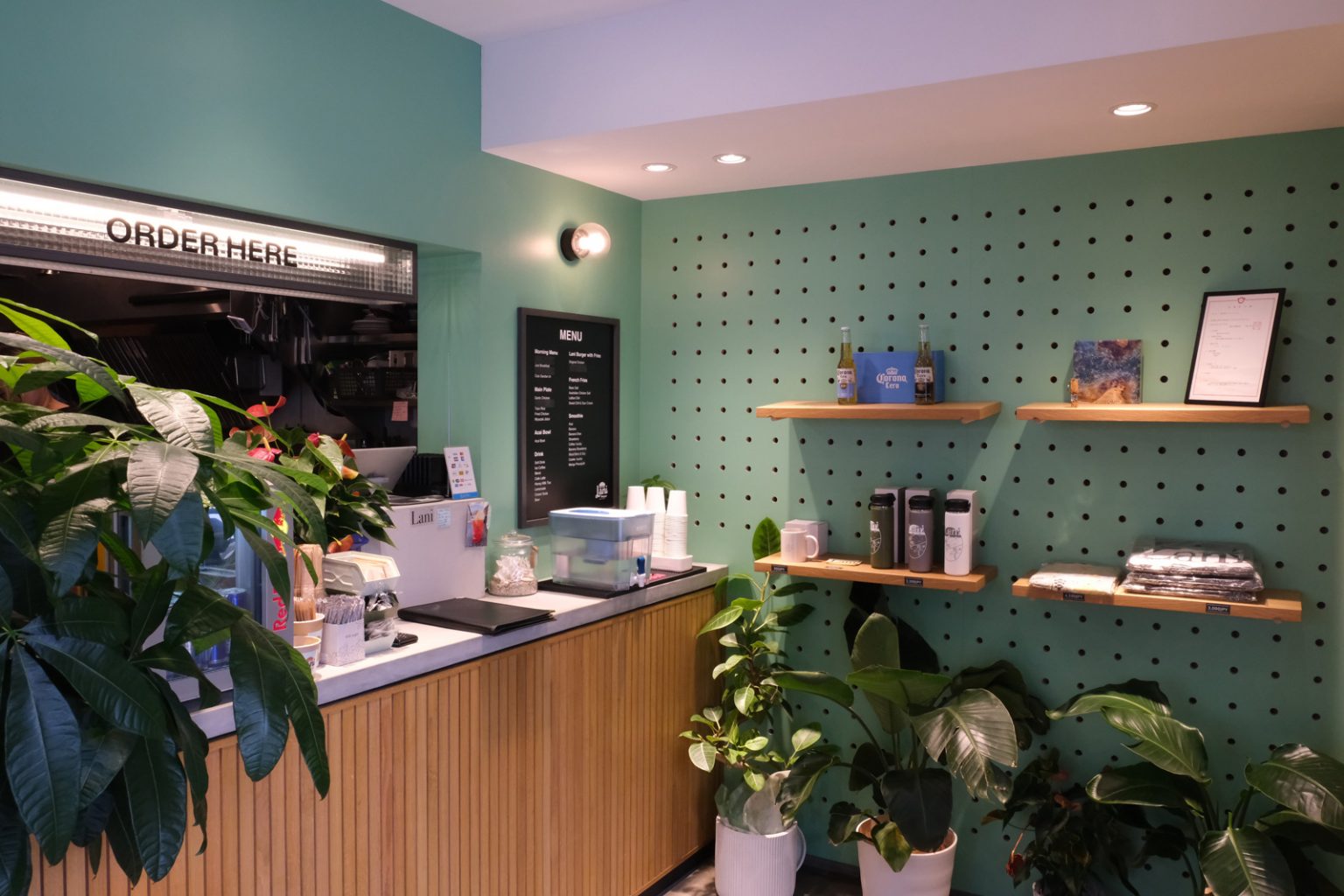 ▲店内の壁面はグレーで、家具類は木目や茶系。真っ白い天井にパステル調のグリーンが、フレッシュな印象を放っています