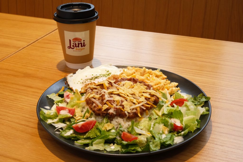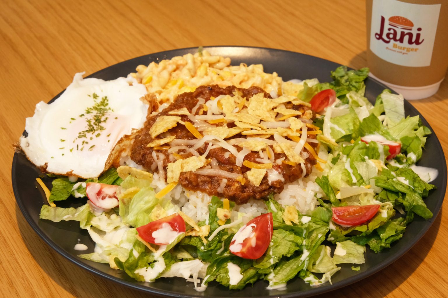 ハンバーガー以外にごはん系メニューも充実しています。手作りのタコソースに、たっぷりの生野菜とチーズ、さらには目玉焼きもトッピングされたタコライスプレートも人気メニューとのこと。他にも、ガーリックチキンやフライドチキンプレートなど、ごはんと一緒に提供する各種プレートメニューも、世代や性別を問わず支持されているそうです。ポーションも多めで、マリンスポーツの後の食事にもぴったりですね。