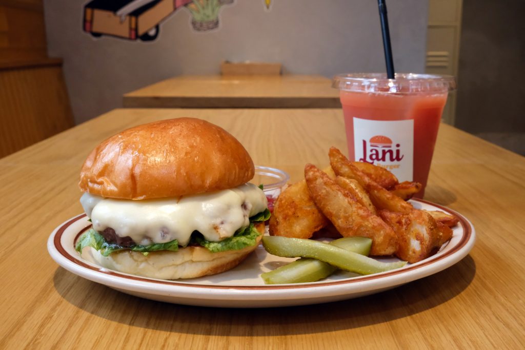 通称マリンロードと呼ばれる鵠沼海岸駅前を東西に貫く道路は、地元のお客さま向けの生活品や食品を扱うお店から、サーフショップまで多様なお店が軒を連ねる鵠沼海岸商店街として古くから親しまれています。車両よりも歩く人と自転車が多く、いつも活気に溢れ、通るだけで元気になるような不思議なストリートです。そんな賑やかな通りを江の島方面へ進んでゆくと、右手にあるのが【Lani Burger 湘南店】です。グレーの外壁に、Lani Burgerのロゴの看板が掲げられ、見落とすことはありません。2025年5月末に開店したばかりのお店です。