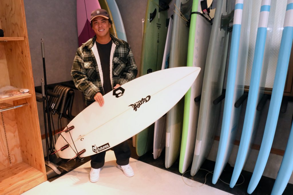 ▲オーナーの川畑 友吾さん。【Lani Burger 湘南店】から歩いて1分ほどの場所にオープンしたサーフィンスクール【Lani Surfing湘南店】にて
