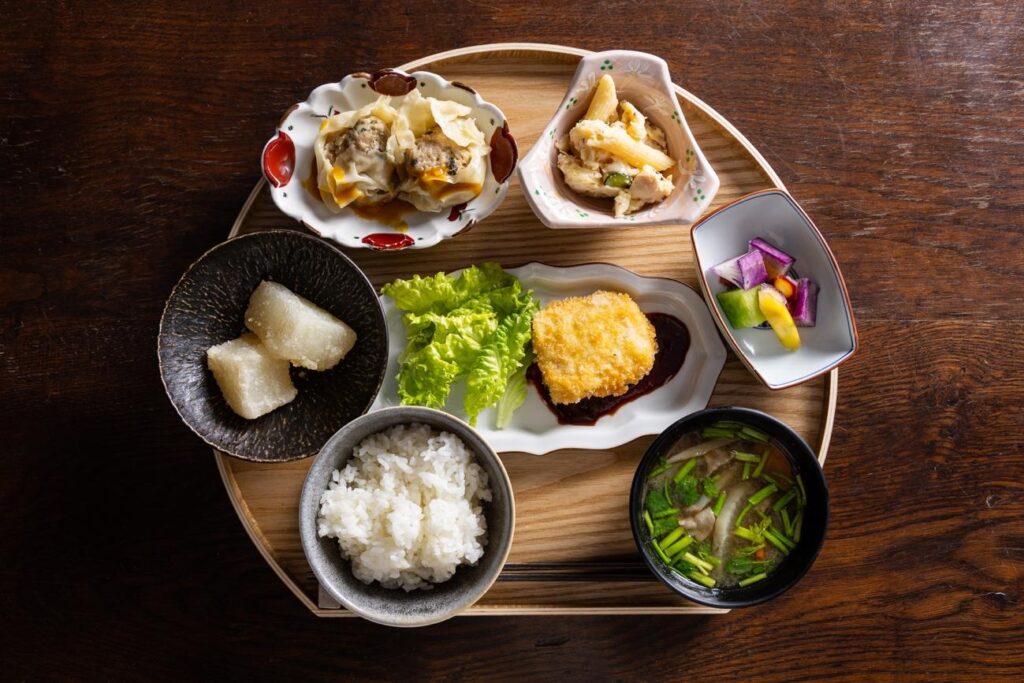 ▲寛ぎのカフェ空間で味わうランチメニュー「ハーベストランチセット」は、数量限定のおばんざい風ワンプレート。店名のHARVEST(ハーベスト=収穫)の名の通り、旬や地域の食材を彩り豊かに取り入れ、その日のおすすめ食材で内容も替わる満足度の高いランチです。この日の主菜は蒸し焼売とカジキマグロの甜麺醤ソース、小鉢はふろ吹き大根の唐揚げ、マカロニポテトサラダ、鎌倉野菜の浅漬け、汁物は豚汁。器はショップで購入もできるので、盛り付けの参考にも!
