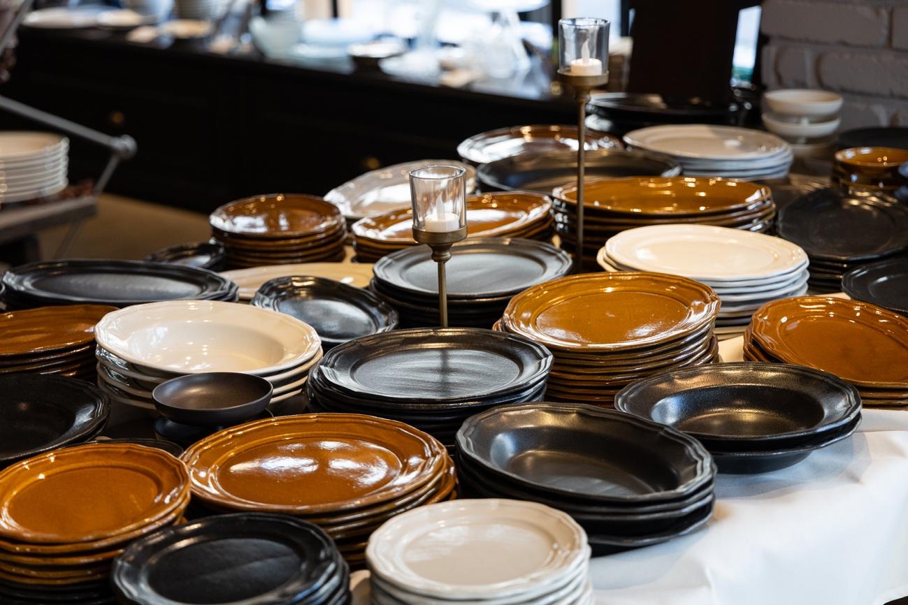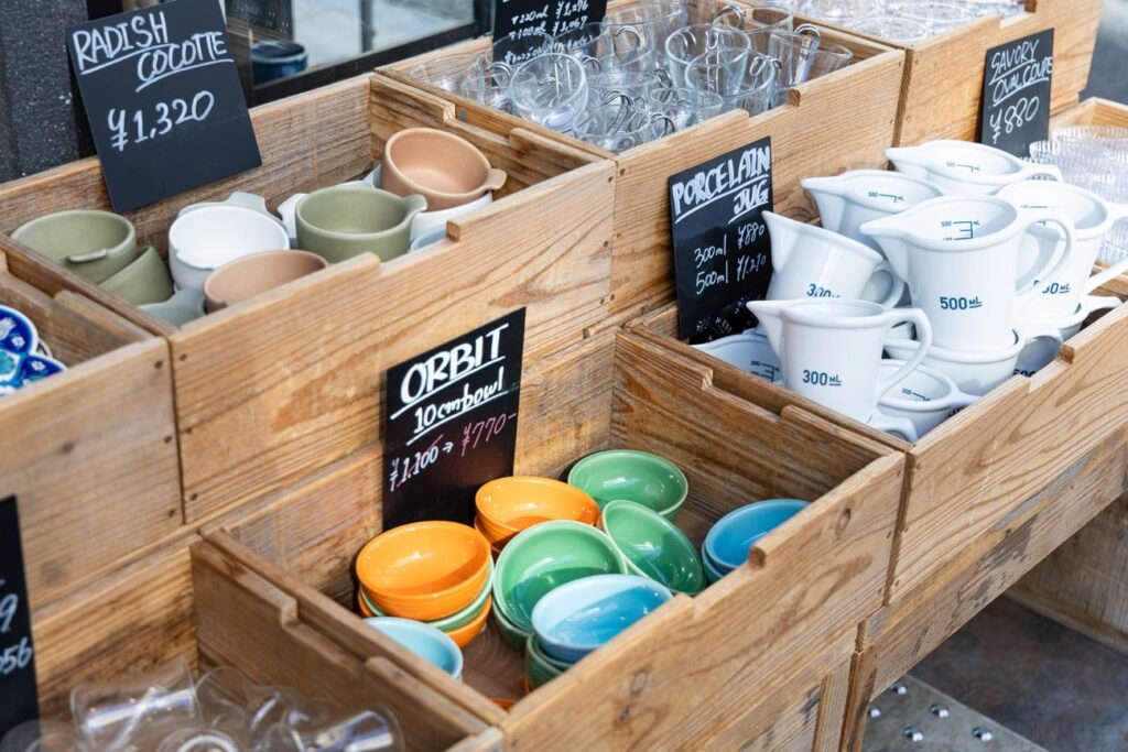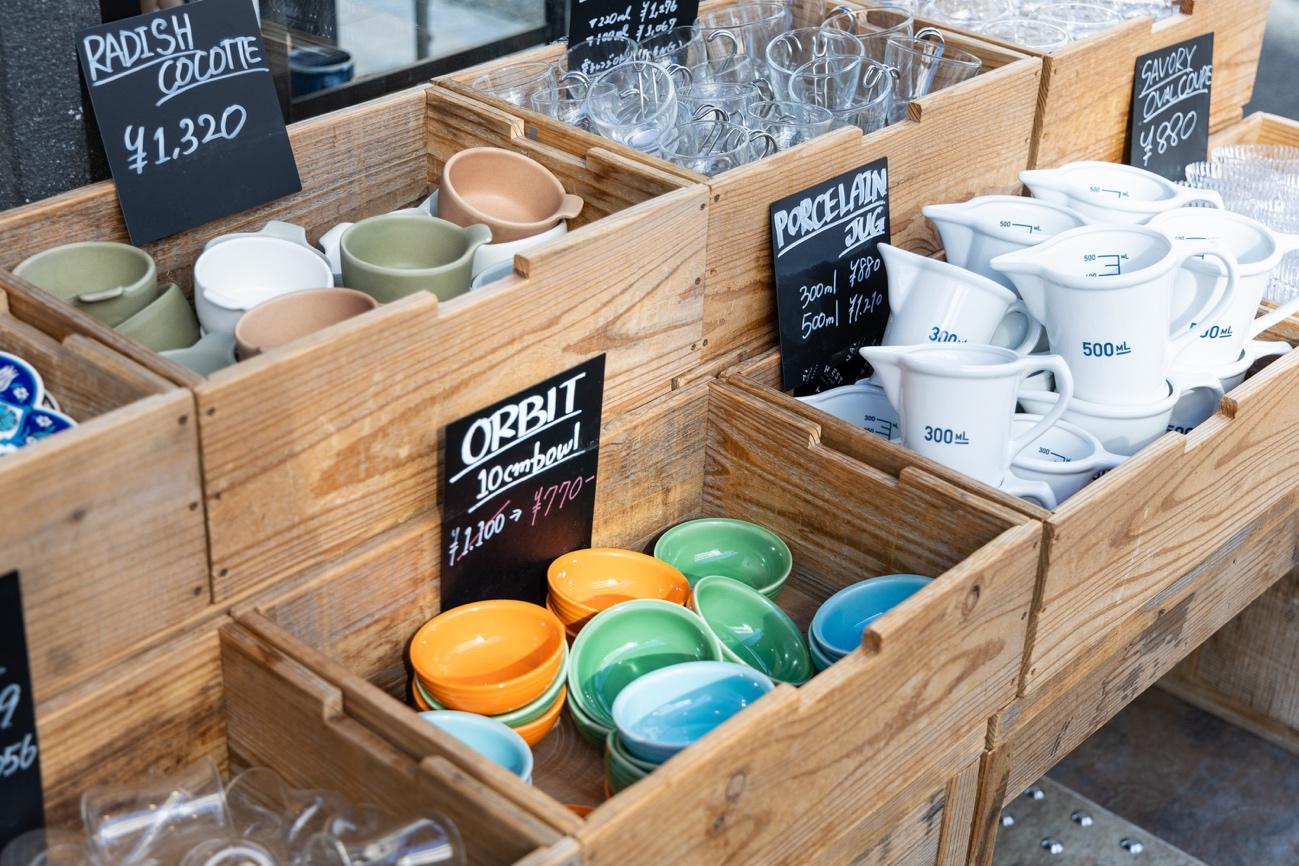 ▲カラフルな食器やカトラリーの他、信楽・益子など国内産地の窯元と共同開発したオリジナルアイテムから地元作家のアイテムまで幅広く展開