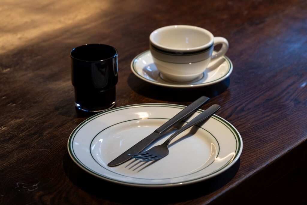 ▲シンプルで飽きのこないデザインが定番人気のアメリカの食器ブランド「Tuxton(タクストン)」Green Bayシリーズ 23㎝サラダプレート、カップ&ソーサー、ハーベストオリジナル「ECHIZEN(エチゼン)×345」タンブラー、「KURO(黒)」 デザートフォーク、デザートナイフ