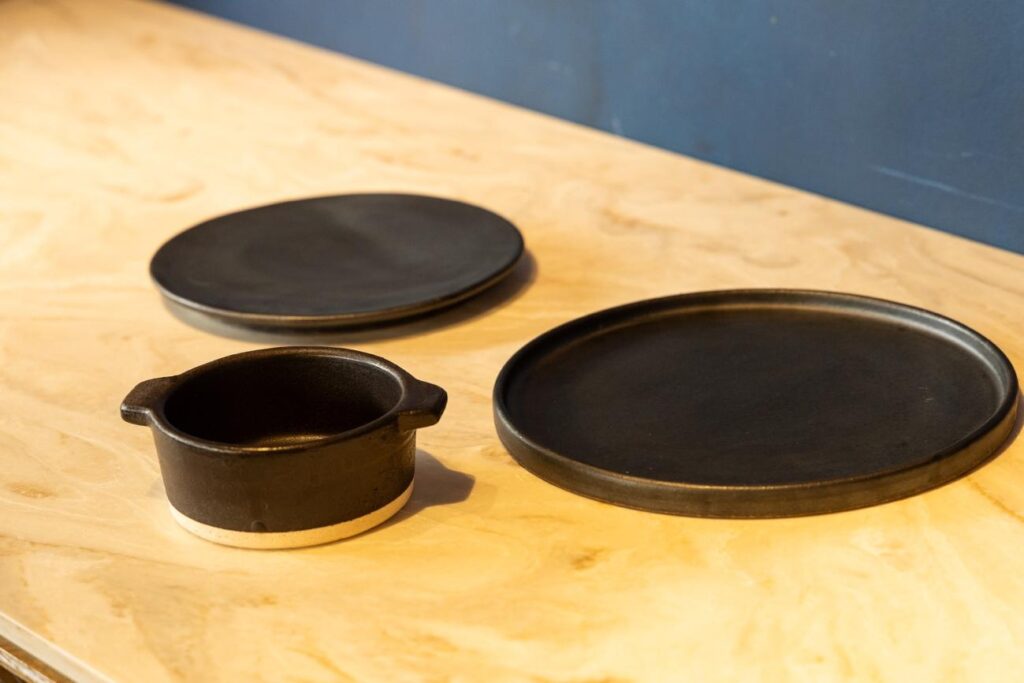 ▲伝統の中にモダンで個性的なエッセンスを融合させたクールでハーベストらしい器「信楽焼Kuro」スタックトレイプレート23cm、グリルポット。 電子レンジ、食洗機、直火、オーブンも使用できるすぐれもの