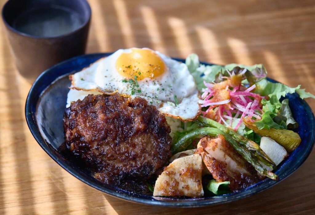 ▲ボリューム満点の「ロコモコボウル」。サラダとスープがつくランチセットは、オムライスやパスタ、カレー、ジャークチキンプレートなどから選べます。ハンバーグ追加など、追加料金でオプションやドリンク、ドルチェもオーダー更可能