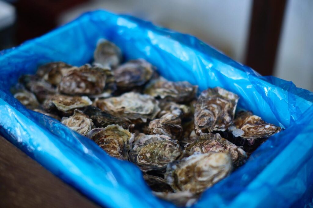 ▲牡蠣を一粒ずつ丁寧に扱いながら、スタッフが店内のカウンターで手際よく手作業で掃除し鮮度を保てるよう保管しています