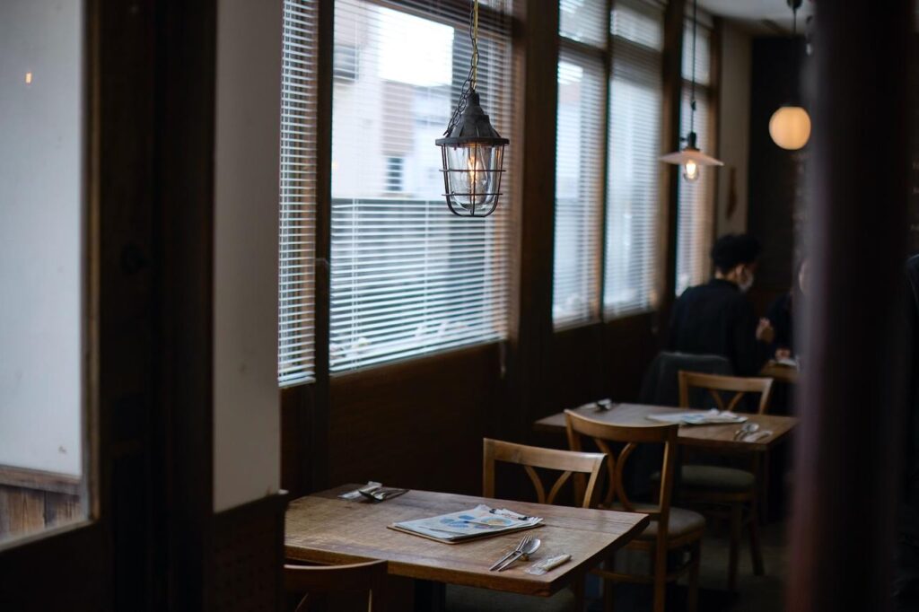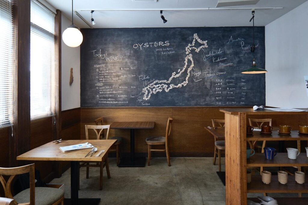 ▲ランプの優しいあかりが灯るシックで落ち着いた店内。壁一面の黒板には、牡蠣の殻を砕きスタッフ総出で手作りした日本地図が。日本全国から取り寄せた各地の牡蠣の情報が紹介されています