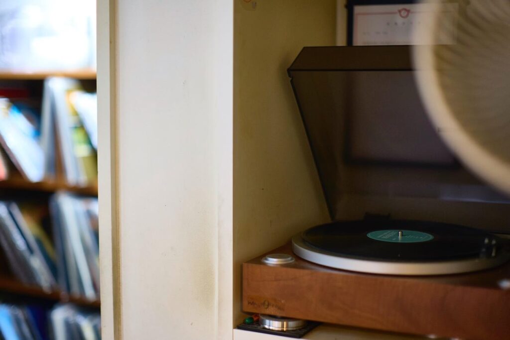 ▲店内のあちこちに店主の音楽好きが伺えるディスプレイが。BGMはロック、ジャズ邦楽と年代もジャンルも様々。家族連れも多いため、上質な音響の大きなスピーカーからはドラえもんのアニメが流れることも!