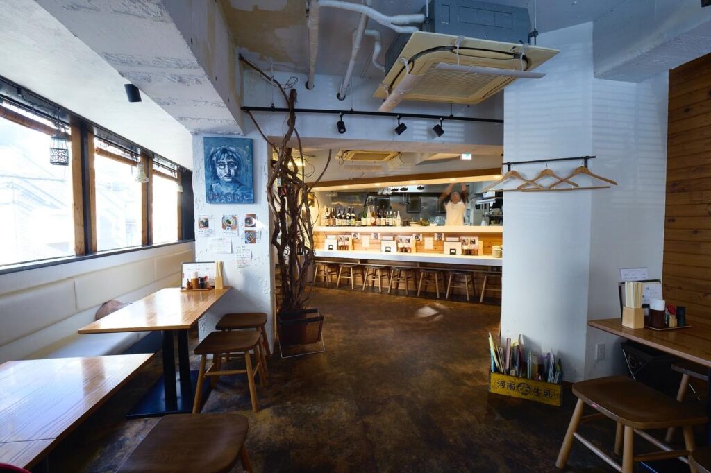 ▲壁一面の窓と広々とゆとりのある店内。厨房前のカウンター7席、ソファを含むテーブル席が28席あり、一人でもグループでも利用しやすいレイアウトです