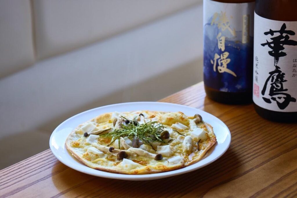 ▲日本酒好きの店主が日本酒に合うピザを考案して生まれた、おつまみピザがこちら。数種のチーズにしめじと角切りのお餅を乗せ、仕上げに天つゆをかけ刻みのりをトッピングした「おもちとしめじのピザ」。他にも「野沢菜と生姜のピザ」、「鶏とごぼうのピザ柚子胡椒風味」など、お酒を飲まなくても気になるメニューが豊富に揃います