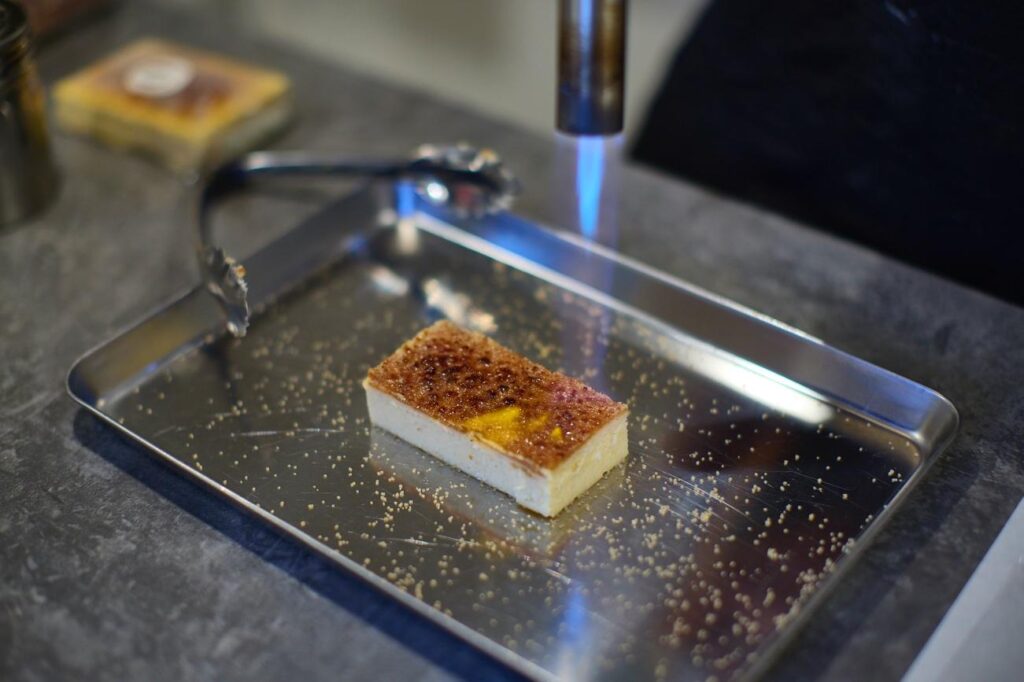 お店のこだわりは、1組ずつの入店でお客様とゆっくり対話しながら選んでいただくこと。チーズケーキはオーダー後、目の前でバーナーで表面を炙りカリカリの状態に仕上げるスタイルで提供。ブラウンシュガーをキャラメリゼした甘く香ばしい香りが広がり、期待感が膨らみます。