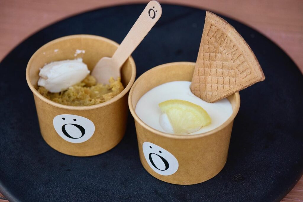 ▲左は、最高糖度75度の金蜜芋をたっぷり使用し、クリームチーズを重ねしっとり濃厚な味わいの「金蜜芋カップチーズケーキ」。右は、北海道早来産の生クリームチーズを使い爽やかなレモン風味に仕立てた「カップ生チーズケーキ」