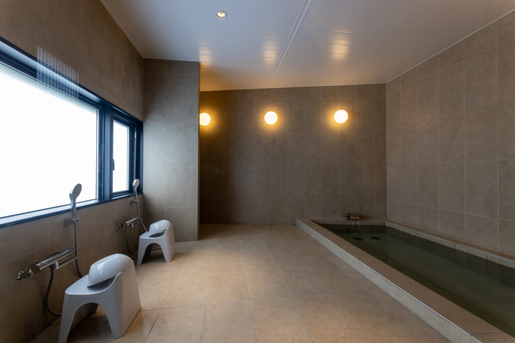 ▲1階にあるバスルームも清潔感あふれ、落ち着いた雰囲気です。1時間ごとに貸し切りでの利用となり、リラックスしたバスタイムを楽しむことができます