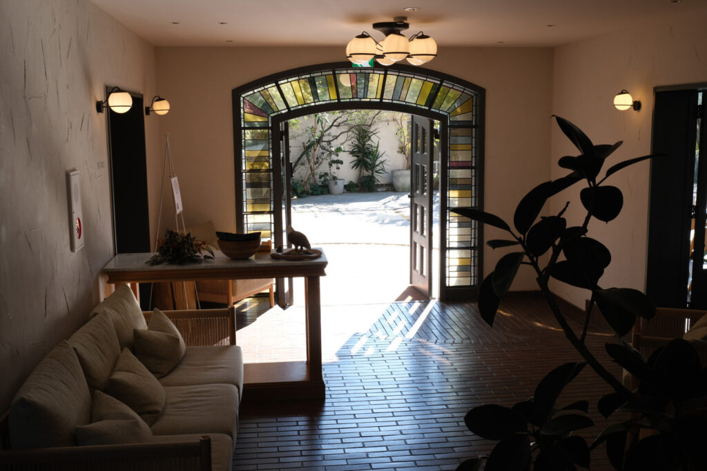 ▲落ち着いたグレージュ色の外壁が、青空と緑豊かな景観に馴染むBIRD HOTEL。赤レンガのアーチと淡い色合いのステンドグラスが映えるエントランスが出迎えてくれます
