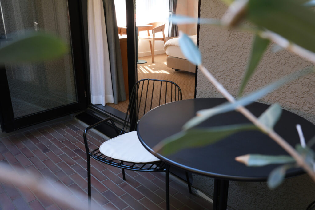 そんな鳥のさえずりや風にのって届く潮騒をBGMに、静かに過ごすのにぴったりの場所が、SUPERIOR DOUBLE A(201)のテラスです。眺望はありません。テーブルと2脚のチェアがあるだけのこぢんまりとしたスペースなのに、何とも言えない心地よさがあります。スマホを置いて、話もせずに、ただ放心する。そんな時間の過ごし方も、お薦めです。