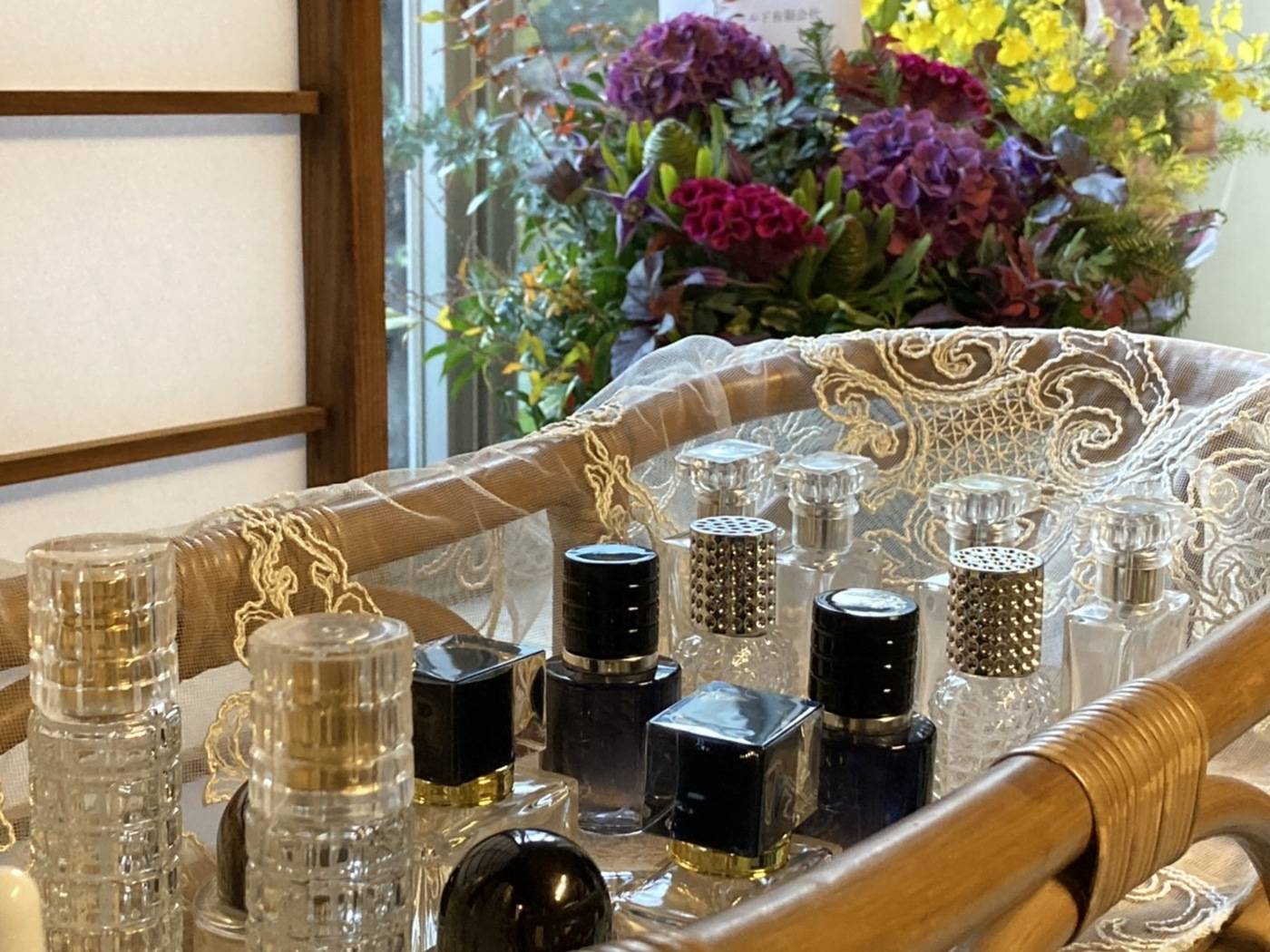 靴をぬいで座ると、きちんと整えられた香りの瓶と、調香師の穏やかな声。香りの方向性を対話しながら見つけていくので、初めてでもすっと背筋が伸びる安心感があります。