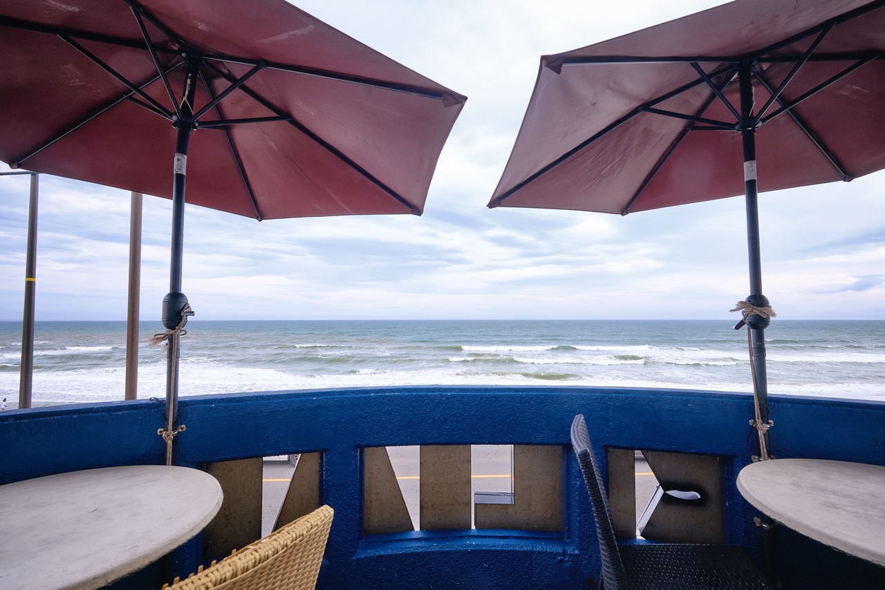 ▲海岸線に突き出すようなテラス席。終日多くの車が行き交う国道134号線も、店からはテラスの壁でちょうど目隠しされるため、どこまでも広がるオーシャンビューを独り占めできます