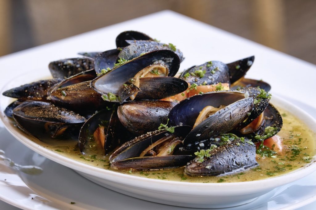 ▲ムール貝の旨味をシンプルに堪能する、ベルギーやフランスでポピュラーな「ムール貝の白ワイン蒸し」は、本場ヨーロッパ流にボリュームたっぷり。食べ終えた後の貝の旨味が凝縮したコクのあるスープは、お好みでパスタに仕立ててくれます