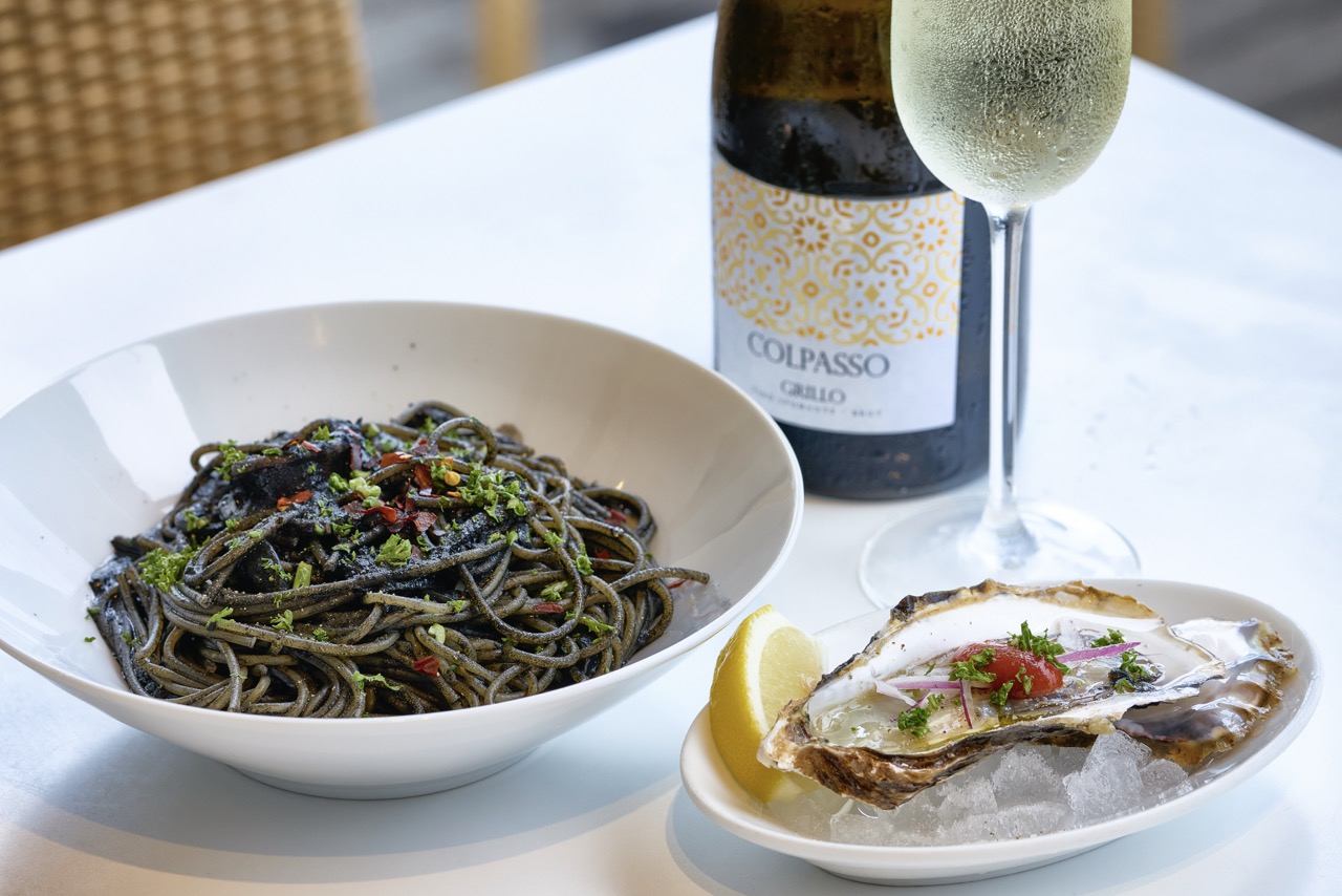 ▲生のイカ墨を使用し、濃厚な旨味と香りと甘味が際立つ「イカ墨のスパゲッティ」。季節ごとに日本各地の新鮮な牡蠣を漁師さんから直接仕入れることで通年食べられる生牡蠣。身がプリプリで濃厚な甘みと風味が特徴の「兵庫県産相生市産カキのカクテルソース添え」と「スプマンテ(グラス)」