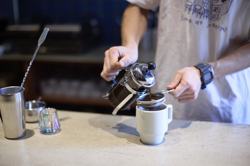 「フレンチプレスで淹れたマンデリン」は、シアトルで毎日フレンチプレスでコーヒーを淹れていた思い出と、焙煎士として生まれて初めて焙煎した豆がマンデリンだったという思い出の組み合わせで生まれた新メニュー。